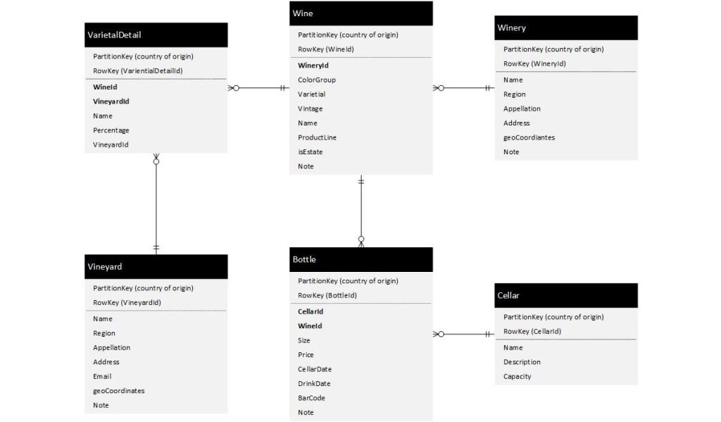 PartitionKey is used to isolate data to a specific cluster. When you get large amounts of data you can move part of it to a different storage account (maybe in a different region) and still treat the data as one large corpus. I chose the Country of Origin and in my one Wine Bottle records the PartitionKey is USA. The RowKey is a string that is a GUID without the dashes. This should be enough for uniqueness in the database but the PartitionKey is just icing on top of the cake. you will see in parentheses what the RowKey is and where there is a relationship the field name is that value. One thing is for certain, I am certain that this representation of the data will change over time and the beauty of Azure Table Storage is it will allow me to do so with little or no pain. However, getting this data into a hierarchy via their “relationship” so that is useful for my application can not be done with a single query to these tables alone as the “relationships” inferred above does not exist in Azure Table Storage. If I want hierarchy (e.g. The bottles of wine in my cellar) I will have to build that programmatically using two distinct queries and some program logic, and that I will leave for future blog posts. However, I can’t leave you without a taste of the fact this is getting real (see: https://mywinedbapi.azurewebsites.net/api/GetCellars).
