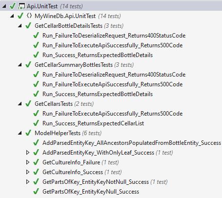 The TableClient class in line 13 is instantiated by the CloudStorageAccount object (storeAccount) created in line 12. TableClient is a public class (with no Interface) and it is where all the action happens with Azure Functions. The storeAccount object is a sealed class, free mocking libraries will not mock it. We would have to fake the storeAccount object and return a mock of the TableClient to test the service class properly. And so, being the poor programmer that I am (financially that is), I am forgoing the tests of the service class. This leaves the three API functions and the “Helper” class that consolidates common code in the API’s. The API’s will emit errors “that we know of” from the service class and we will have to be satisfied with that. The list of tests follows: